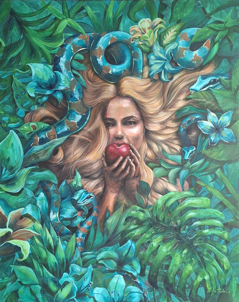 Para a mostra de 2026, Paula apresenta a obra “Livre Arbítrio”, descrita como uma releitura do mito de Eva. Na pintura, o gesto de provar o fruto deixa de ser tratado apenas como transgressão moral e passa a simbolizar a travessia entre inocência e consciência. A proposta coloca a obra em diálogo com temas clássicos da arte e da condição humana, sem abrir mão de uma leitura autoral. Segundo a apresentação do trabalho, a composição busca se conectar com o público pela força do conceito, pela escolha cromática, pela gestualidade e pela liberdade criativa.