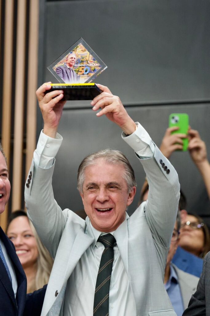 A sessão solene pelos 77 anos de emancipação político-administrativa de Barueri, realizada na manhã desta quinta-feira (26) na Câmara Municipal, foi marcada por homenagens à cidade, pelo lançamento do selo e do carimbo comemorativos dos Correios e por uma forte exaltação à trajetória de Rubens Furlan. No ano em que completa 50 anos de vida pública, o ex-prefeito foi o nome mais celebrado do plenário, recebeu troféu em referência à data e ouviu de autoridades presentes que sua história se confunde com a própria fase de crescimento do município.